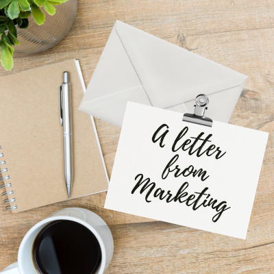 handwritten note sitting on desk next to notepad, pen, and coffee, text reads Letter From Marketing